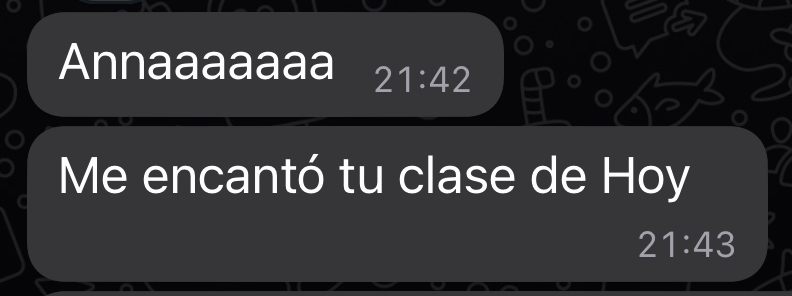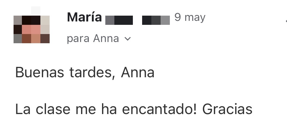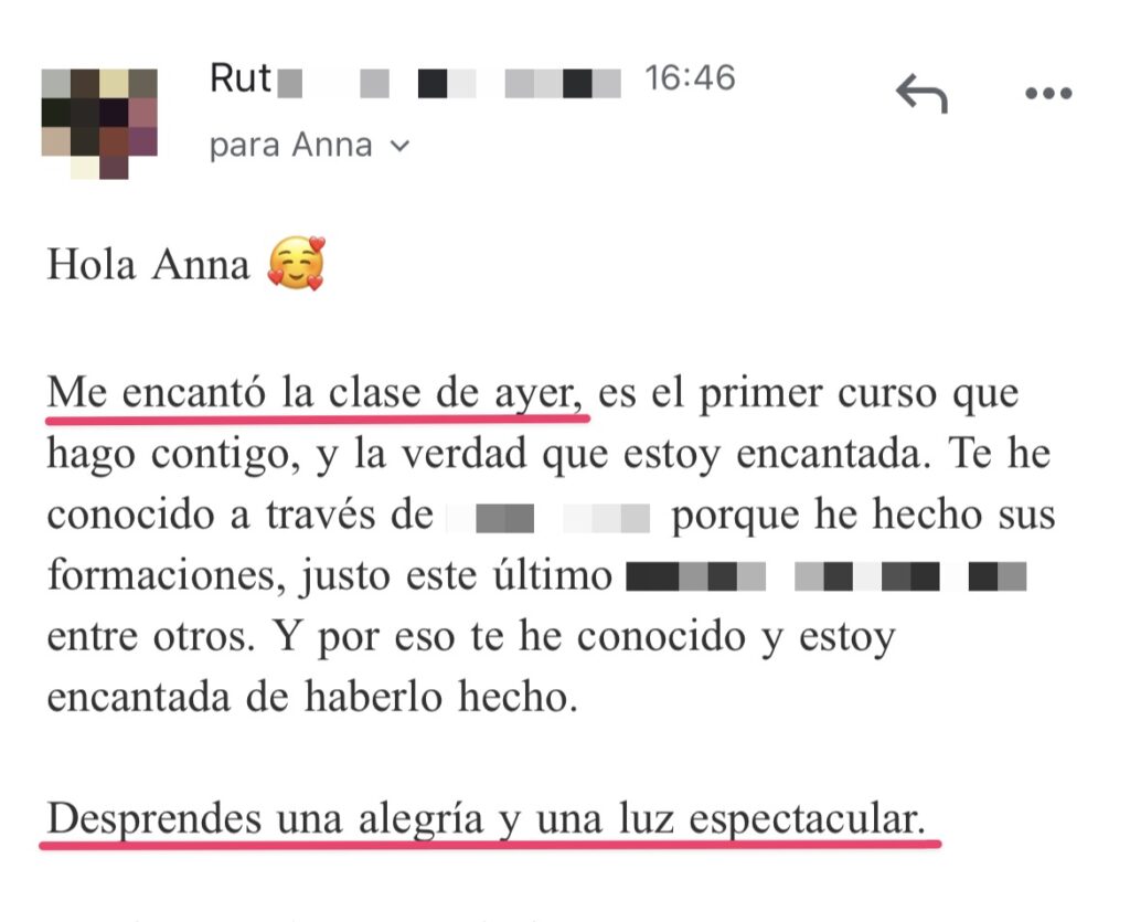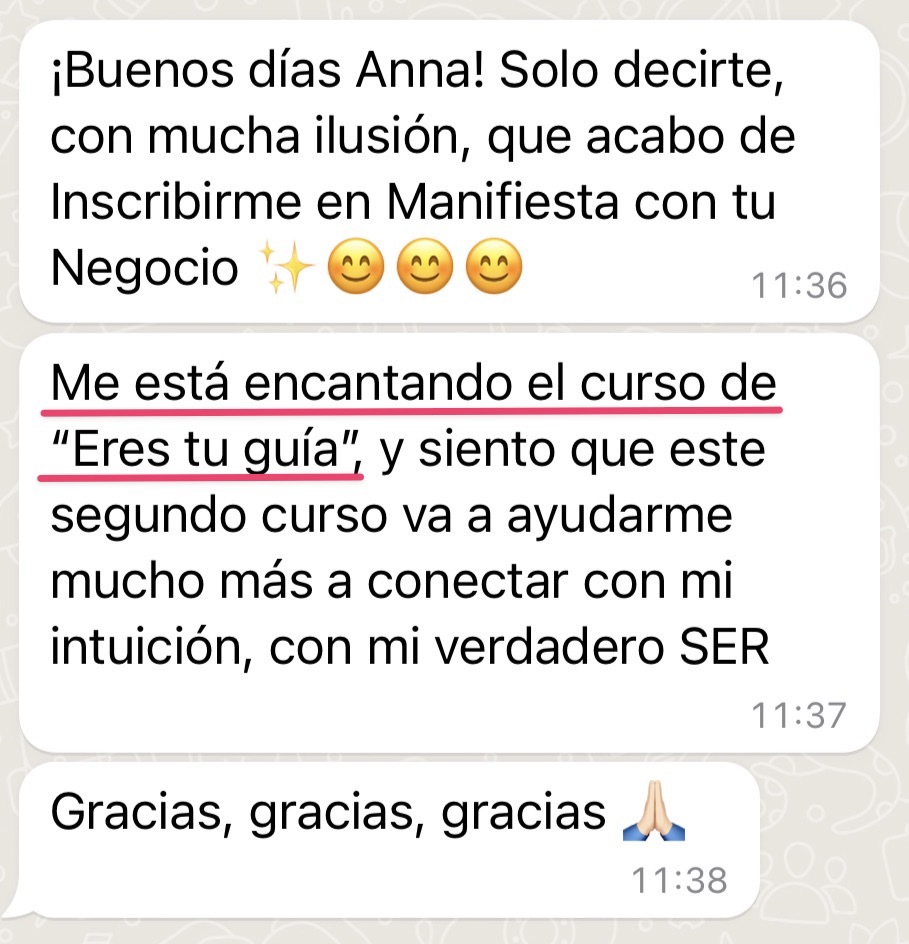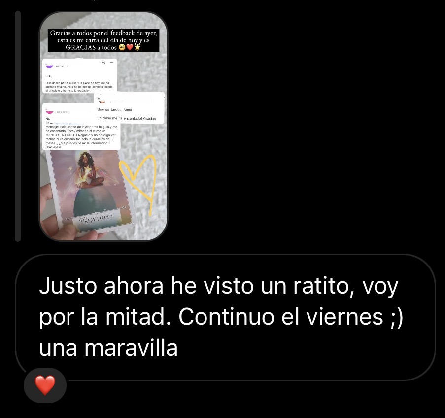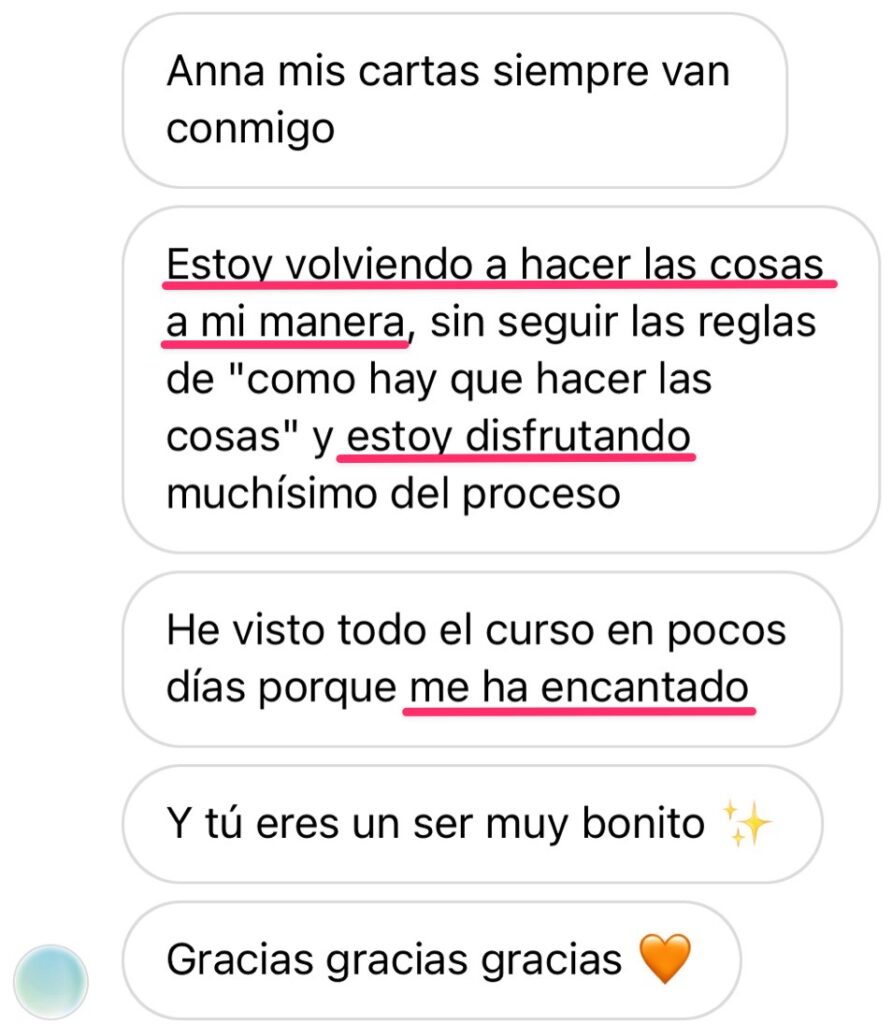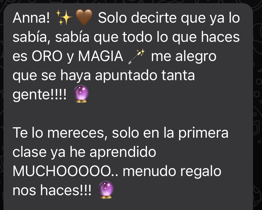 Las clases con Anna me ayudaron a tener más claridad, a volver mi atención a lo que realmente importa y a lo que necesito ahora. Tras terminar el curso siento que tengo a todo el universo y a mis seres queridos de luz para que me guíen en mi jornada. Ahora puedo confiar y soltar. ¡Gracias!