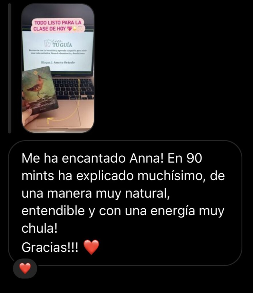 Sentía mucha curiosidad por aprender a leer el Oráculo. No solo he aprendido a hacerme tiradas a mi misma y a los demás, sino que he descubierto que me encanta. Me siento mucho más conectada con mis Guías, y es maravilloso. Anna nos enseña a usar las cartas para empoderarnos usando nuestra intuición, no para «predecir el futuro». Y sí, ¡me siento empoderada al tener una herramienta de consulta que refuerza mi intuición!