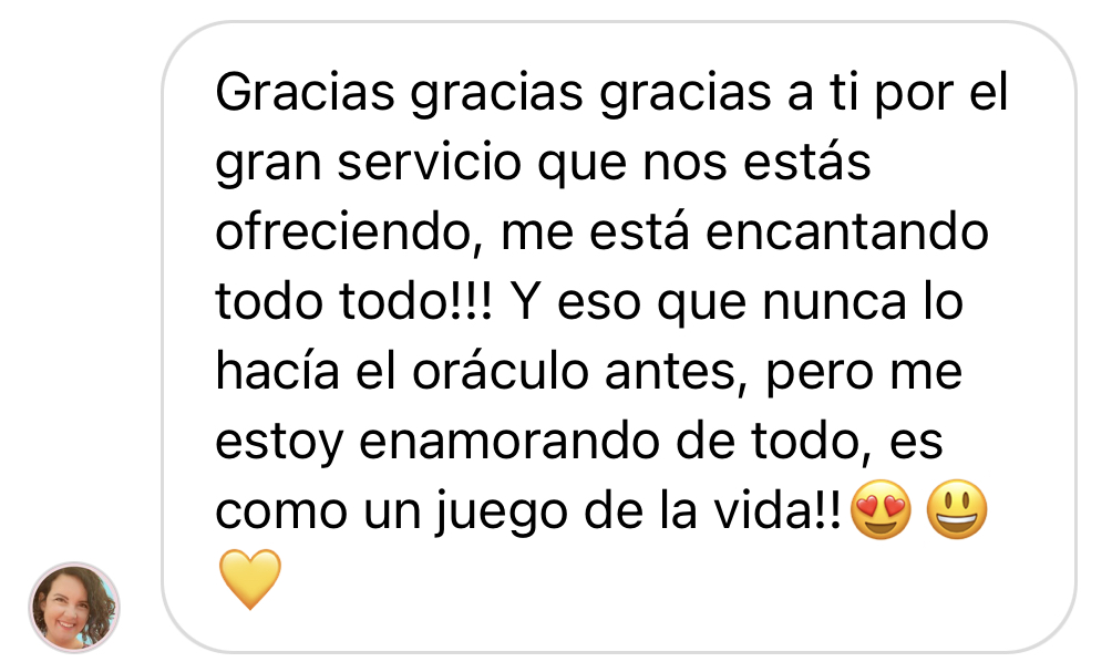 Ahora sé que es posible usar el Oráculo en mi día a día de manera práctica y divertida. Realmente me sorprendió. Me gustó mucho el enfoque en el que se basa, ya que nunca es negativo ni imperativo. Son orientaciones positivas y constructivas. Lo recomiendo 100%.