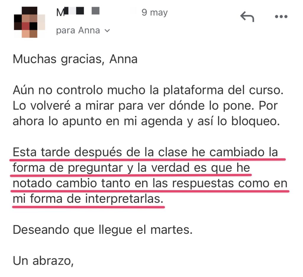 El paso a paso de Anna, junto a su claridad y entusiasmo, me permitieron empezar a hacer lecturas fácilmente. Ahora dispongo de una herramienta de sabiduría divina de la que carecía. ¡Me alegro de haber participado y lo recomiendo!