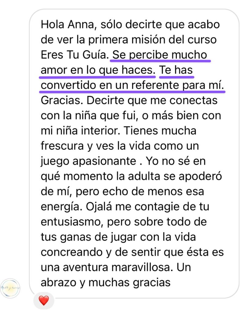 El curso Eres tu Guía llegó a mi vida en el momento preciso. Me sentía desconectada de mi misma, de mi intuición y de mi creatividad, dudaba mucho de mis ideas y de las acciones a realizar…